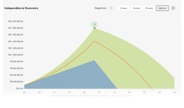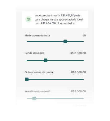 Com certeza! Você terá acesso a aba ‘’Futuro’’ onde consegue colocar seus objetivos pessoais e calcular em tempo real a sua aposentadoria para conseguir viver de renda e realizar seus sonhos separando investimentos de curto, médio e longo prazo, considerando seu perfil, metas e possibilidades de investimento.